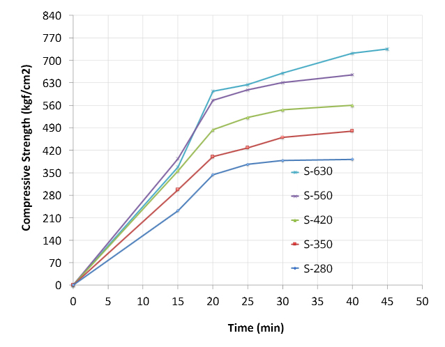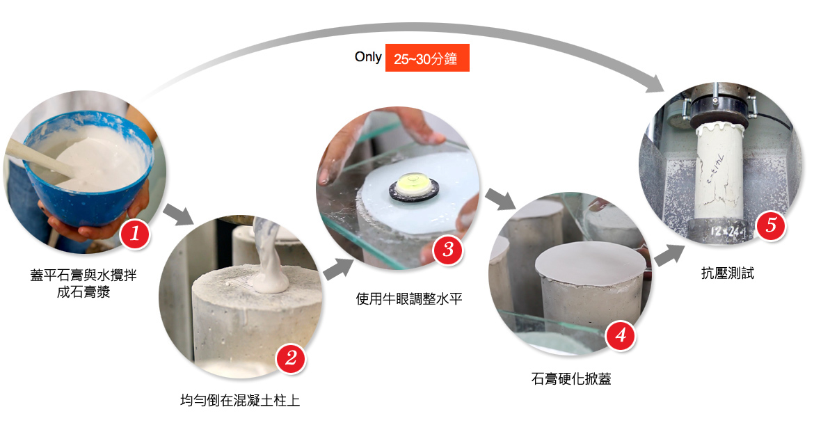 30分鐘內,蓋平石膏的強度快速提升至5000~9000psi(kgf/cm2) 這是個完全針對混凝土蓋平抗壓測試所生產的高強度石膏 並且完全符合台灣CNS 11297/1232與美國ASTM C617/C39 與的規範。