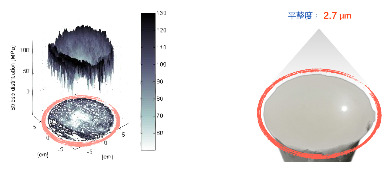 高平整度試體表面是來自於可流動的石膏漿和有一定厚度的玻璃所得到的結果。石膏漿在蓋上玻璃後,會變的和玻璃表面一樣,如同鏡子一般,表⾯面平整度為2~3um(如右圖所示)。